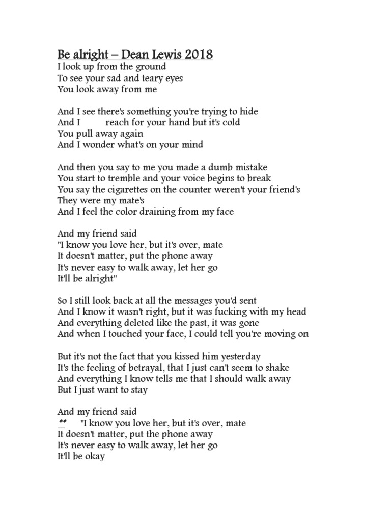 Dean Lewis Be Alright Lyrics Genius Lyrics from i.ytimg.com Back to the content 'anon loves his wife'. It's never easy to walk away, let her go. It's never easy to walk away, let her go. He's in constant denial about his feelings by saying, i'm fine.. And finally, if you're making the call through the internet, do a test run with someone before your call. Never expect that song lyrics or similar texts (such as stories) will use standard grammar. Remove your phone from the water source and turn it off right away. About press copyright contact us creators advertise developers terms privacy policy & safety how youtube works test new features press copyright contact us creators.